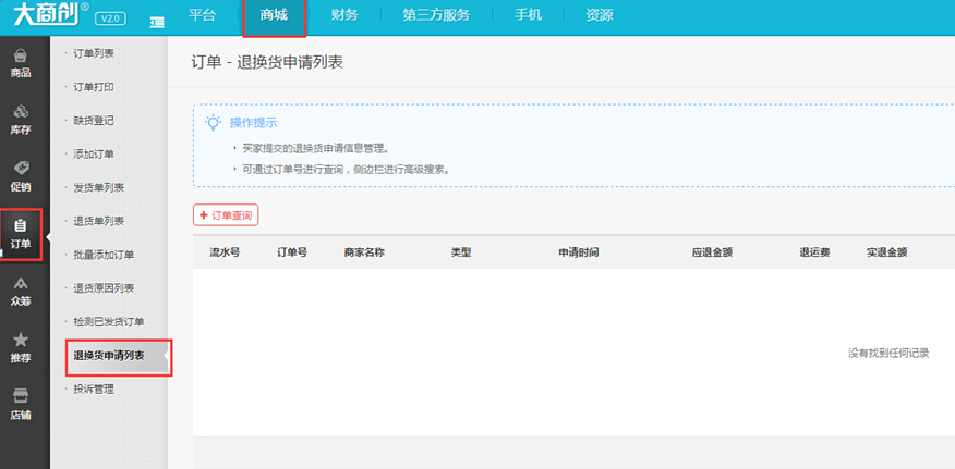 提交完成后,后台管理员可在 商城--订单--退换货申请列表里操作退换货的订单